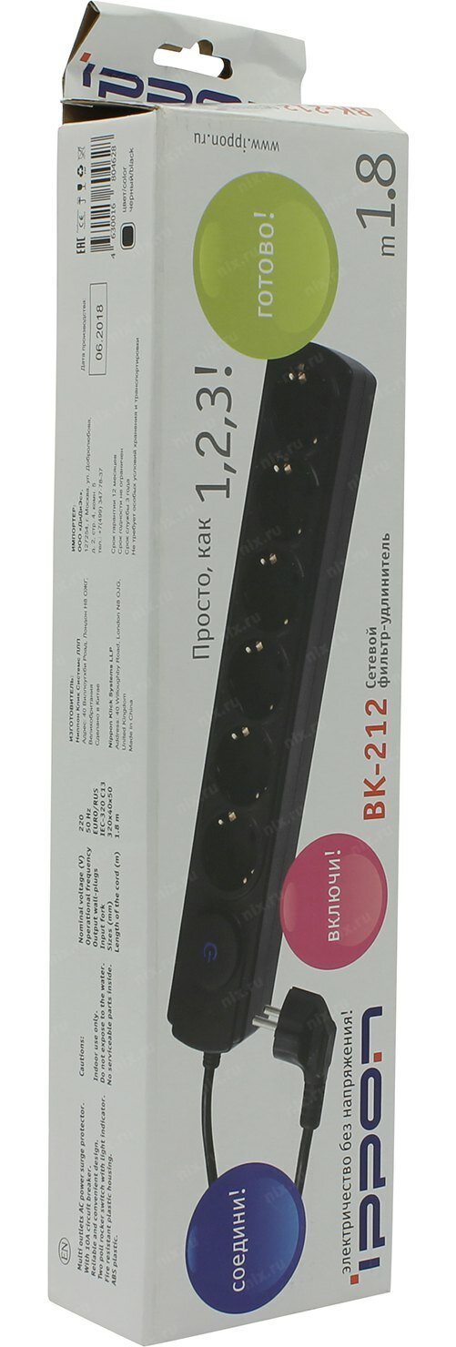Купить Сетевой фильтр Ippon BK212 1.8м (6 розеток) черный (коробка)