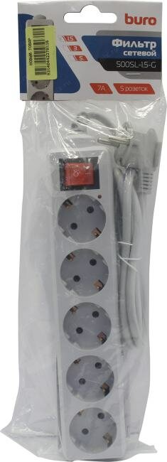 Buro Сетевой фильтр, 5 розеток, 1.5 метра, 500SL-1.5-G , серый пакет ПЭ