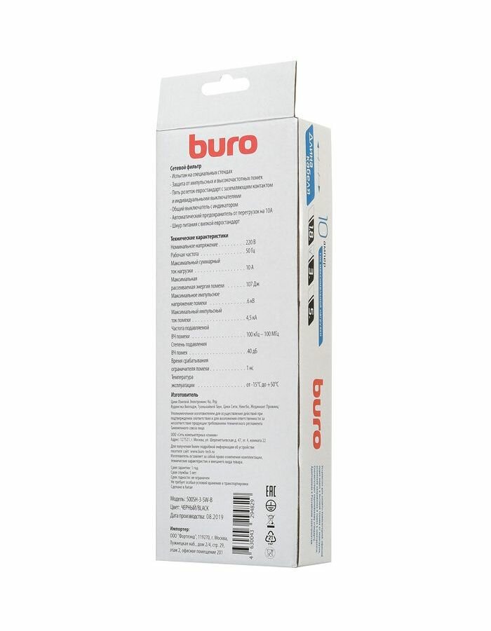 BURO Сетевой фильтр 5 розеток (500SH-3-SW-B) 3м, черный коробка (1159726)