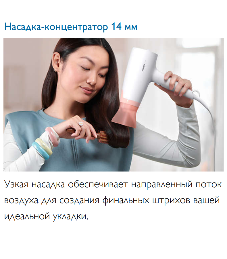Фен Philips/ 1600 Вт, 3 режима, насадка ThermoProtect, концентратор, шнур 1,8 м. Цвет: белый с розов