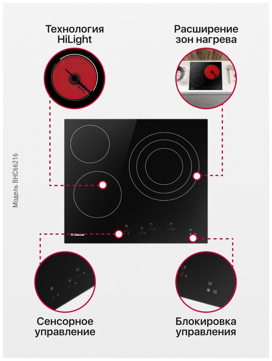 Электрическая варочная панель Hansa BHC66216, встраиваемая, 60 см, автоматика закипания, стеклокерамика с сенсорным управлением