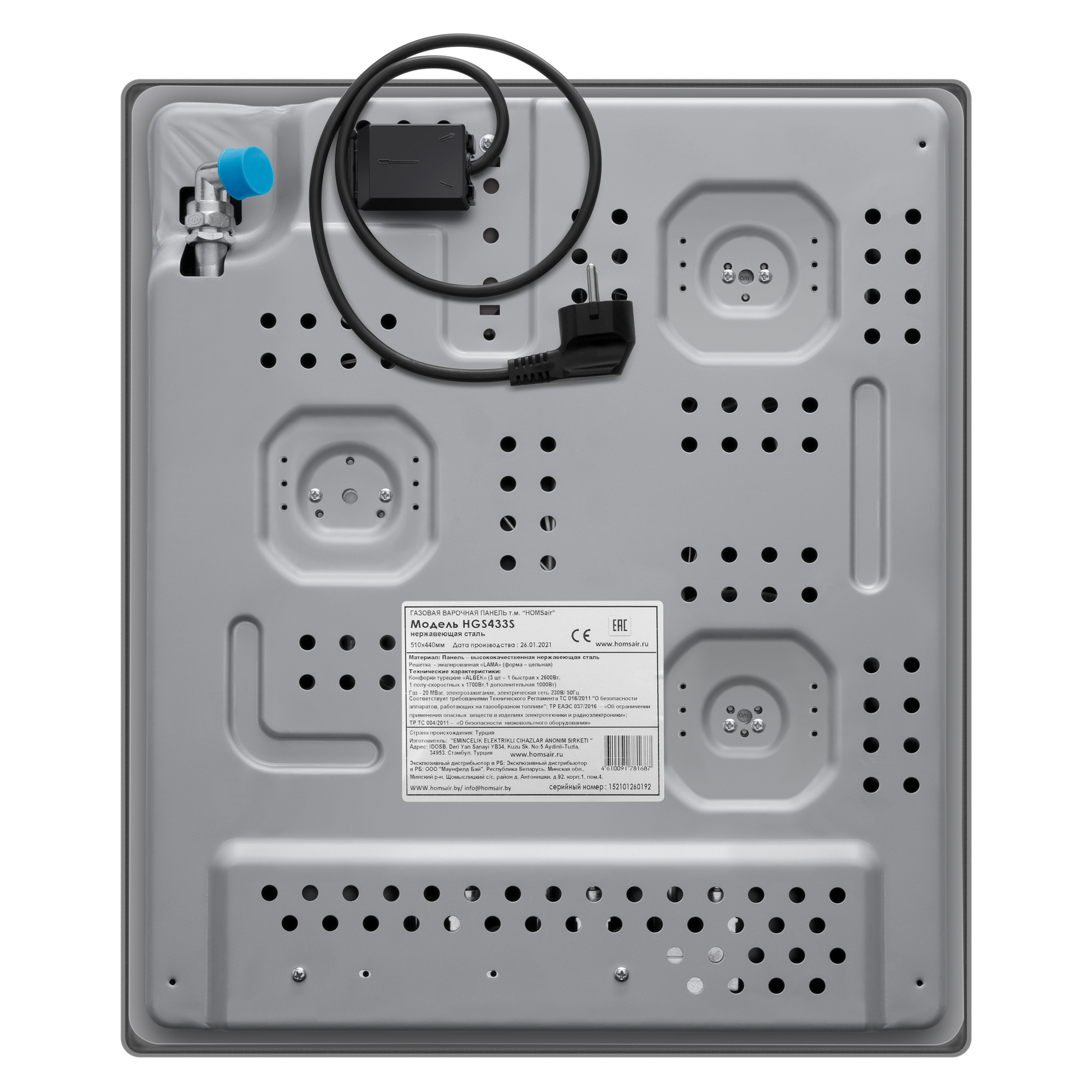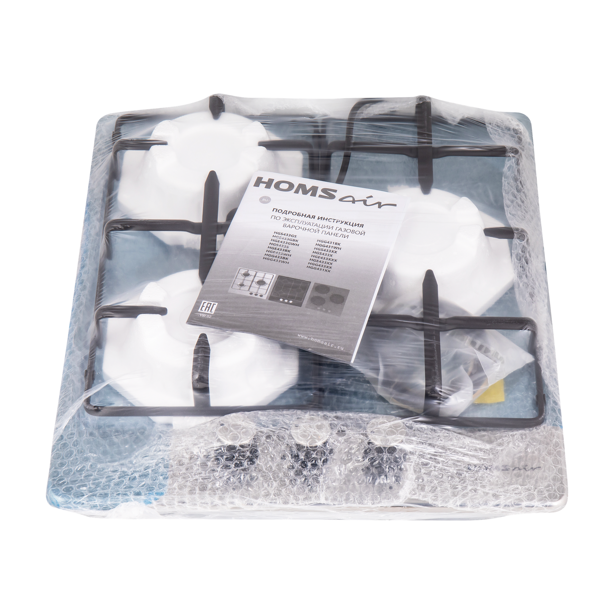 ГазоваяварочнаяповерхностьHOMSairHGS433S[нерж.сталь,конф.-3шт,эл-поджиг.,реш.-эмал.сталь,
