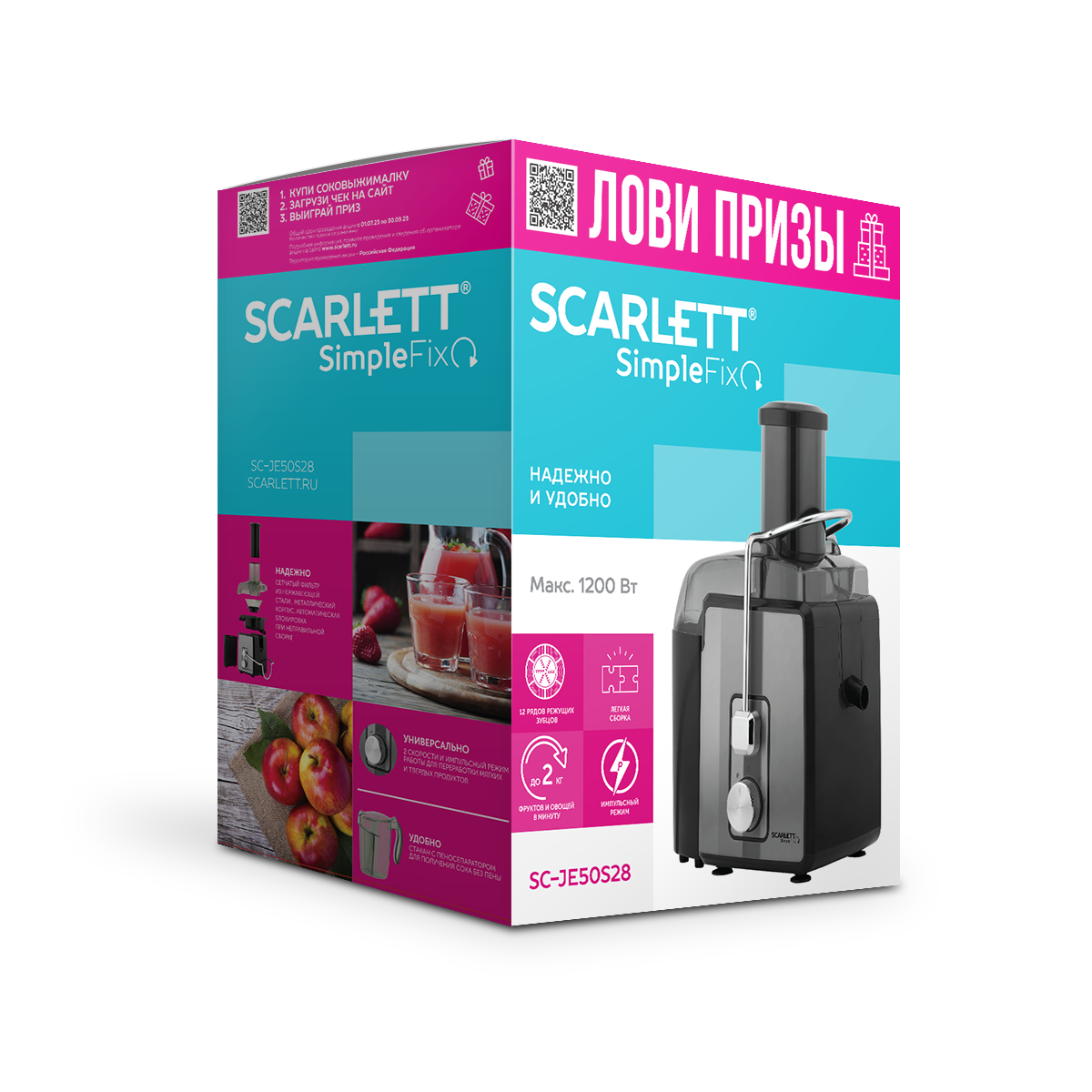 Соковыжималка центробежная электрическа Scarlett SC-JE50S28, стальной корпус, SimpleFix 1200 Вт