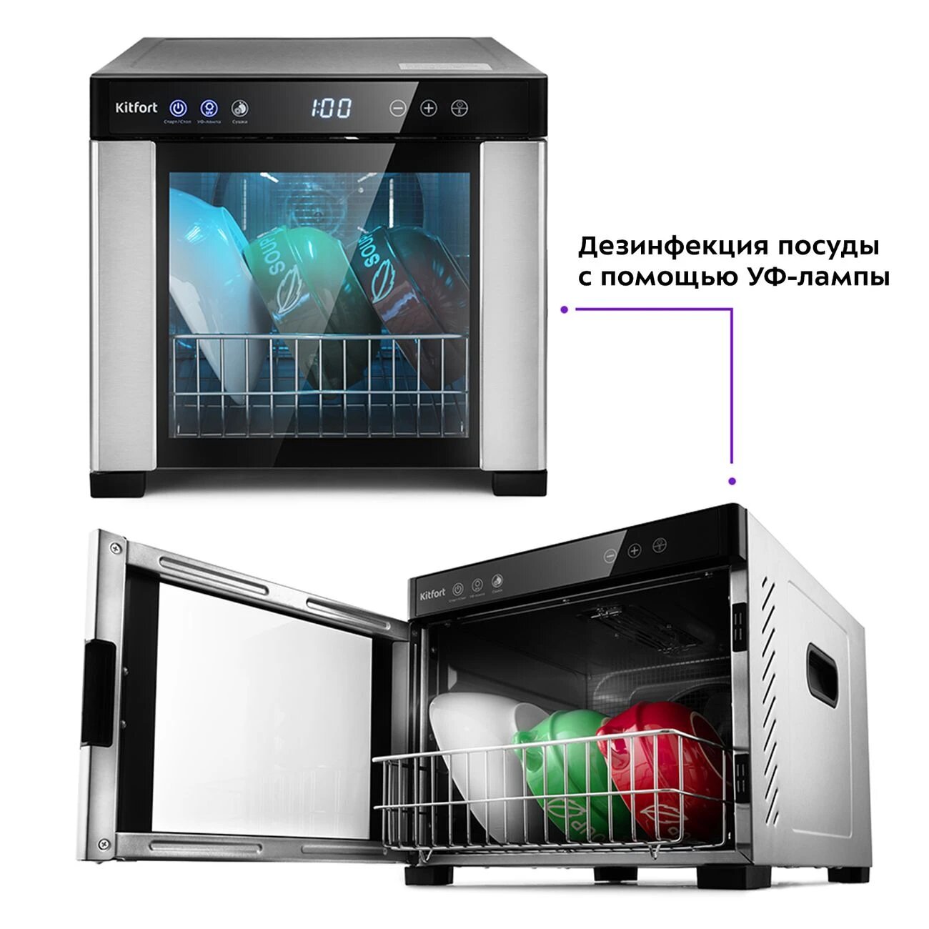 Уф излучение Вместимость Без посторонних запахов Металлический корпус Регулировка температуры и времени сушки |