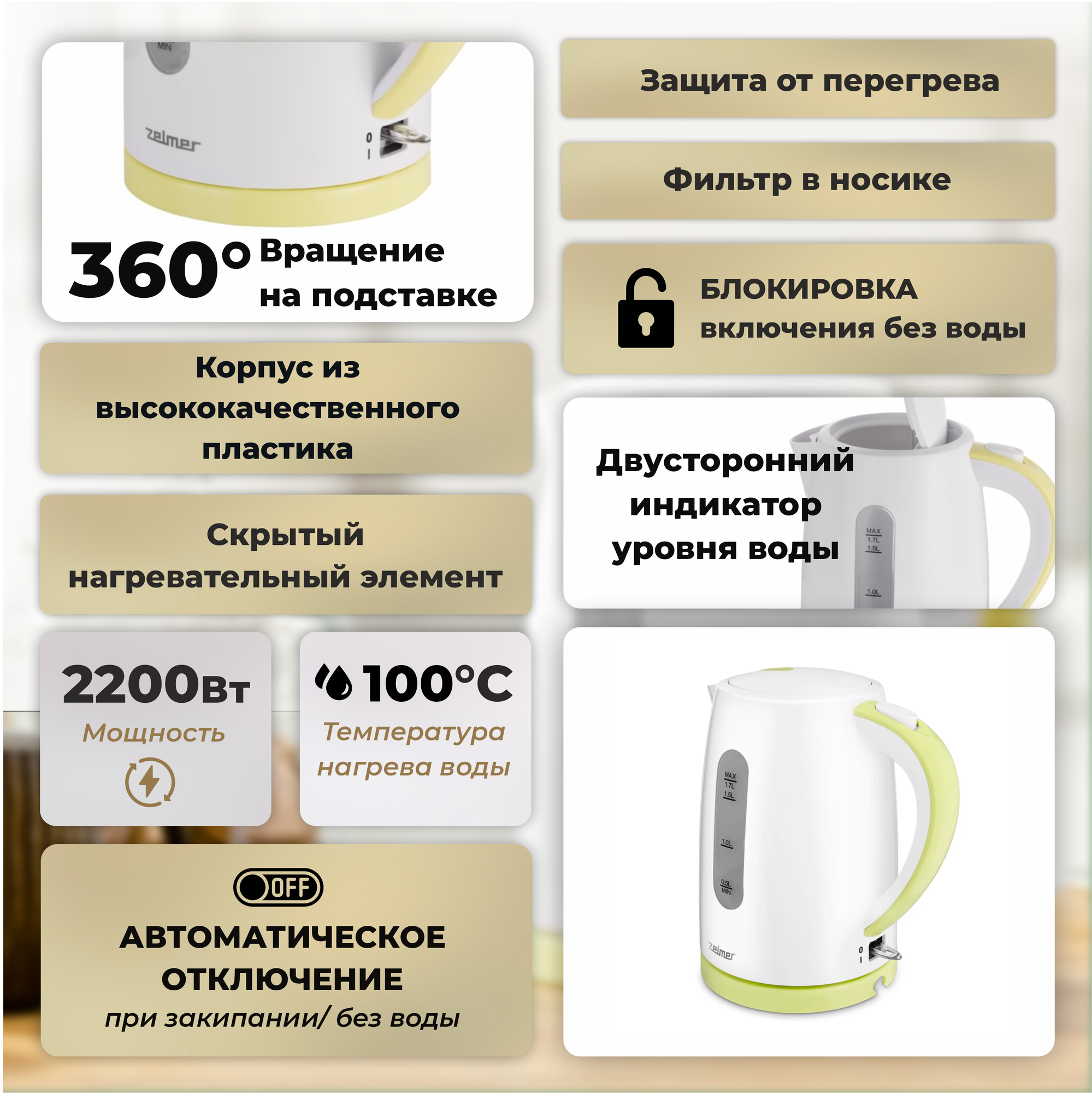 Чайник Zelmer ZCK7616L Lime White (2200Вт,1.7л,пластик,закрытая спираль)