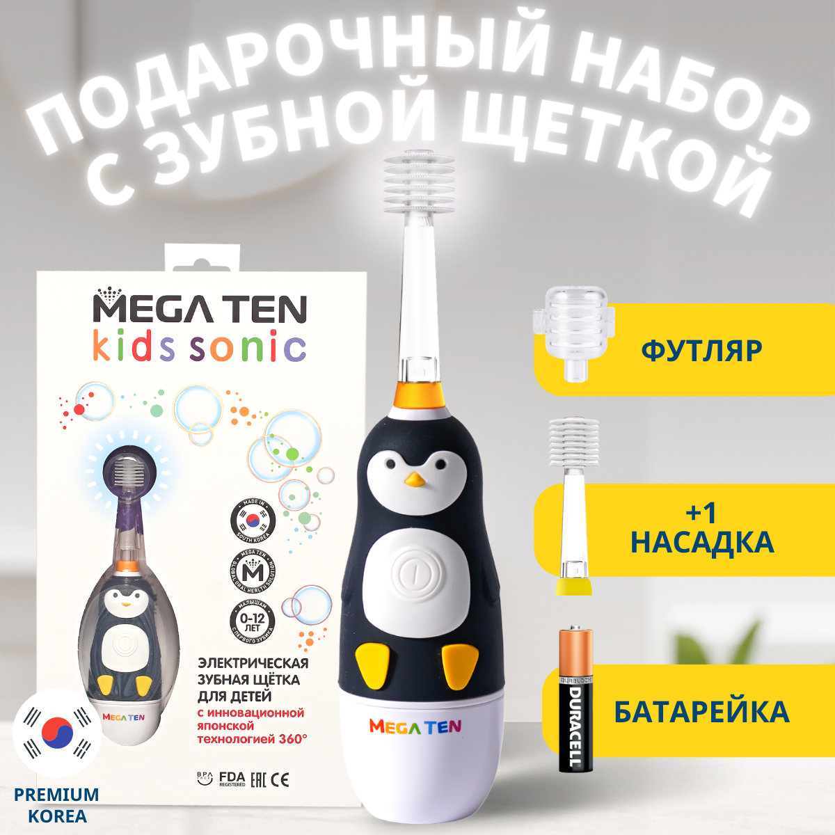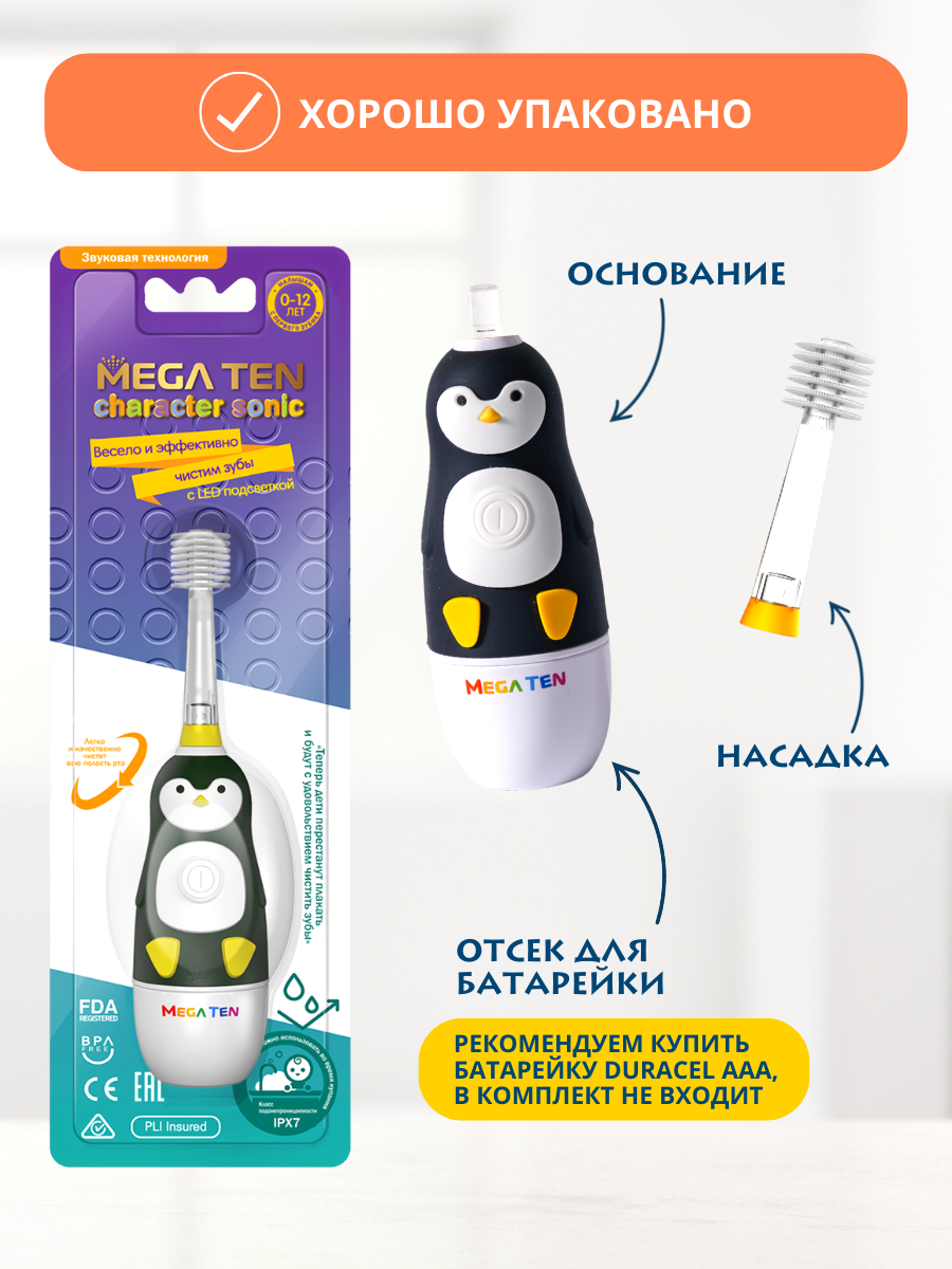 Электрическая детская звуковая зубная щетка пингвиненок В наборе MEGA TEN megaten KIDS SONIC интересное: