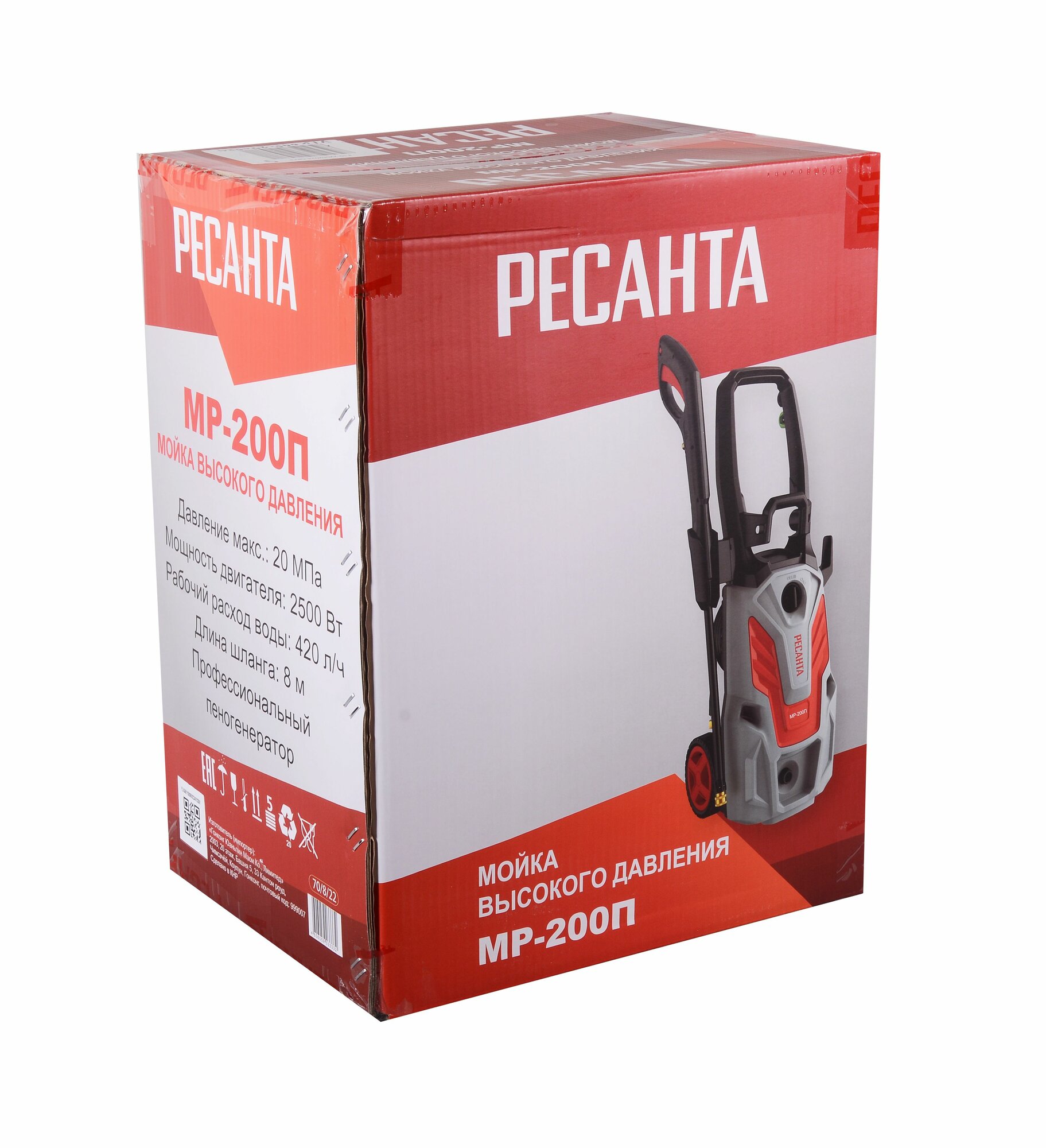 Мойка высокого давления РЕСАНТА МР-200П, 2500 Вт, 200 Бар, 420 л/ч, шланг – 8 м, проф. пеногенератор