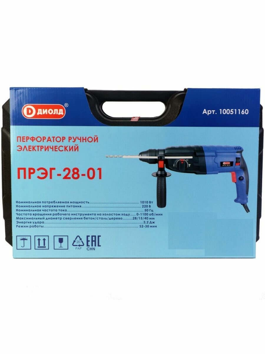 Перфоратор ударный диолд ПРЭГ-28-01 в кейсе / регулировка оборотов 0-1100об/мин, 1010 Вт, 5200уд/мин, 3,2 Дж, 3 режима, SDS+, производитель Россия