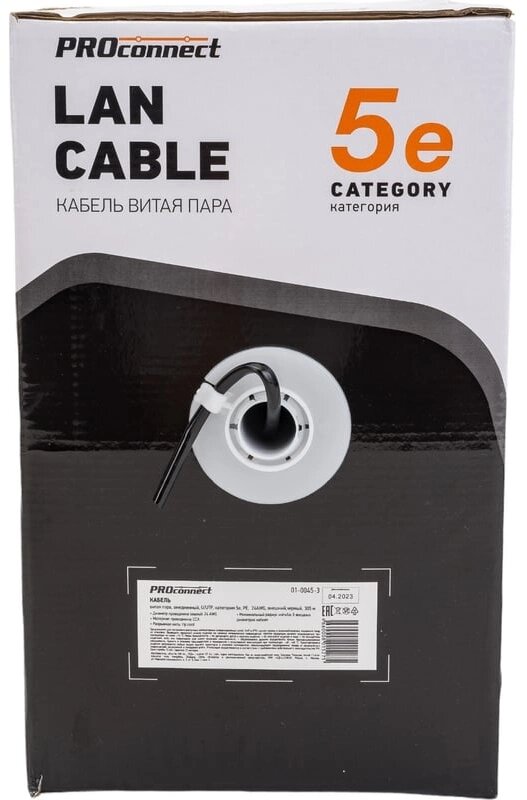 Витая пара 01-0045-3 ∙ Кабель витая пара омедненный, U/UTP, Cat.5e, PE, 4PR, 24AWG, Outdoor, Solid, черный, 305м, PROconnect