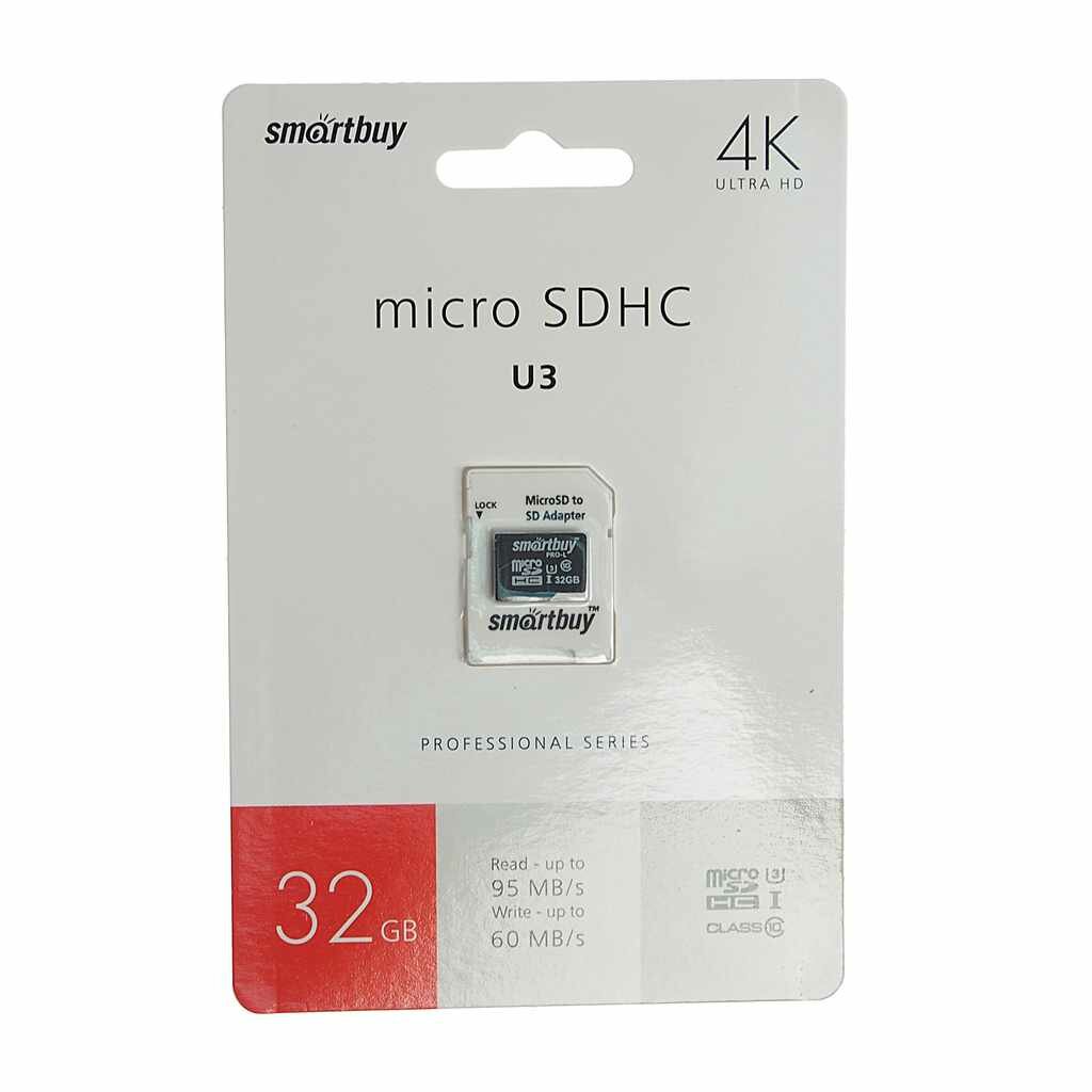 micro SDHC карта памяти Smartbuy 32GB Class 10 PRO U3 R/W:95/60 MB/s (с адаптером SD)