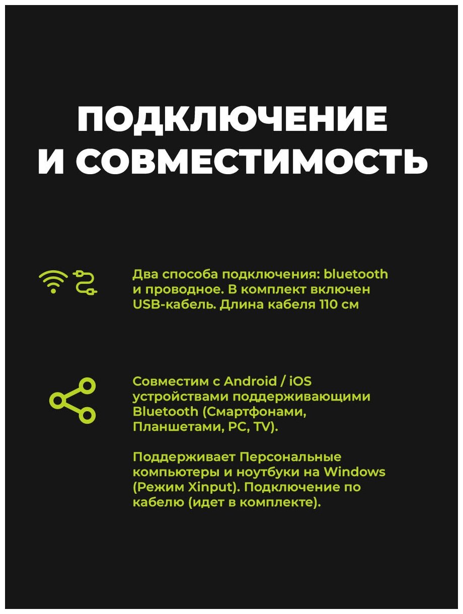во-первых, сия штуковина вообще никак не контачится по блютуз от собственной батареи, т.е. все мигает, телефон видит его в устройствах, но подключение сбрасывается, иногда с надписью "неверный пароль", НО, в прошивке геймпада не предусмотрена отправка запроса пин, и никакими программами это не решается. те, "завести" его можно только от розетки или с повербанка во-вторых, батареи хватает на 10-15 минут максимум в-третьих, даже если играть с зарядкой, каждые 5-10 минут подключение сбрасывается и может быть (не всегда) тут же восстанавливается, но большинство игр после такого переподключения перестает его распознавать в-четвёртых, когда ставишь его на зарядку, загораются все 4 индикатора, и выйти из этого режима на подключение к андроид или вообще выключить НЕВОЗМОЖНО, он виснет намертво, помогает только иглой reset нажать из мелочей: очень вонючий пластик, стики продавливаются внутрь примерно на полсаниметра, крепление не в состоянии удерживать телефон (надо проклеивать) в общем, не выполняет свои прямые задачи, деньги на ветер |