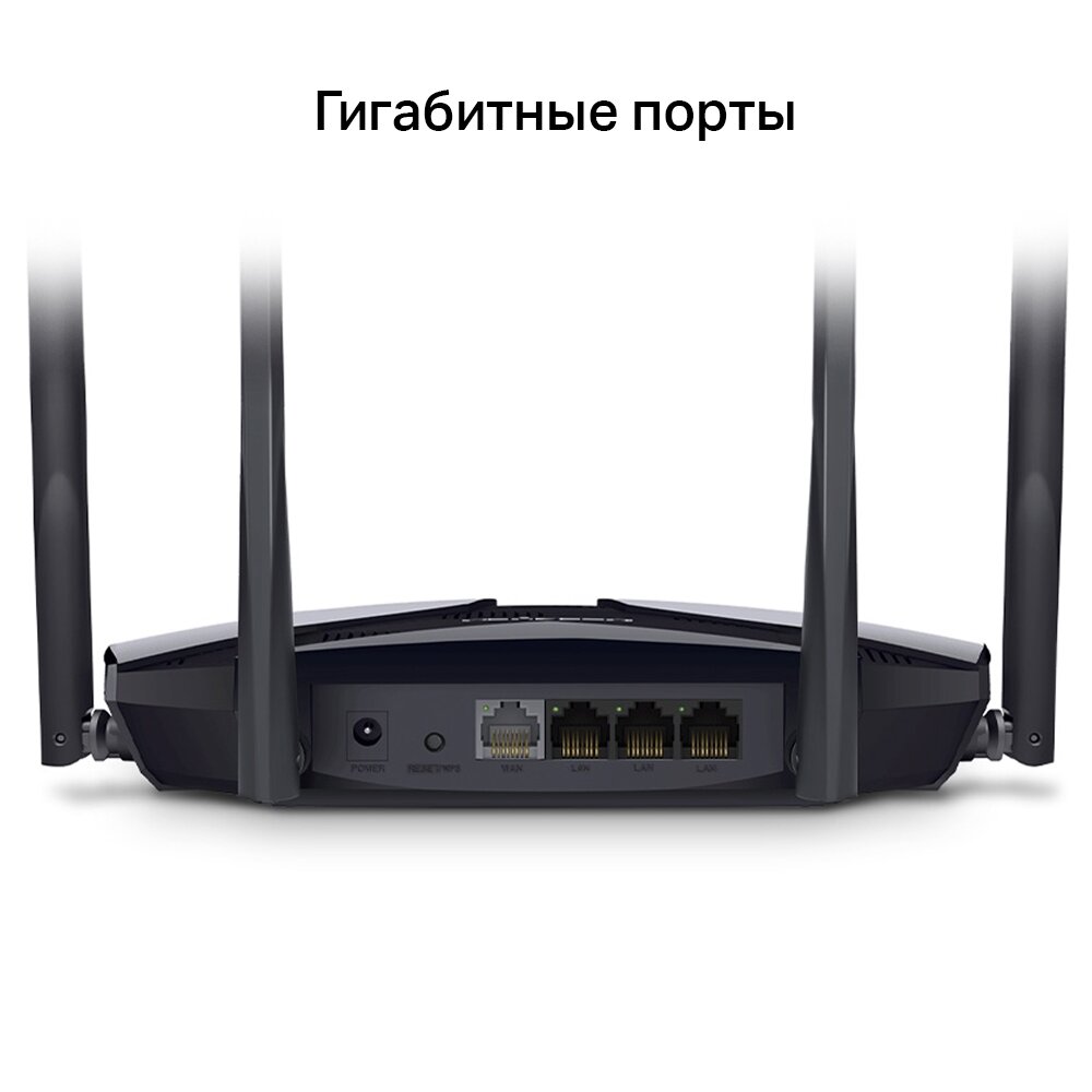 Mercusys MR70X AX1800 Двухдиапазонный Wi-Fi 6 роутер, 1201 Мбит/с на 5 ГГц и 574 Мбит/с на 2,4 ГГц, 1 порт WAN 10/100/1000 Мбит/с и 3 порта LAN 10/100/1000 Мбит/с, 4 внешние антенны 5 дБи, поддержка IPTV, IPv6, родительский контроль, WPA3, интерфейс настр