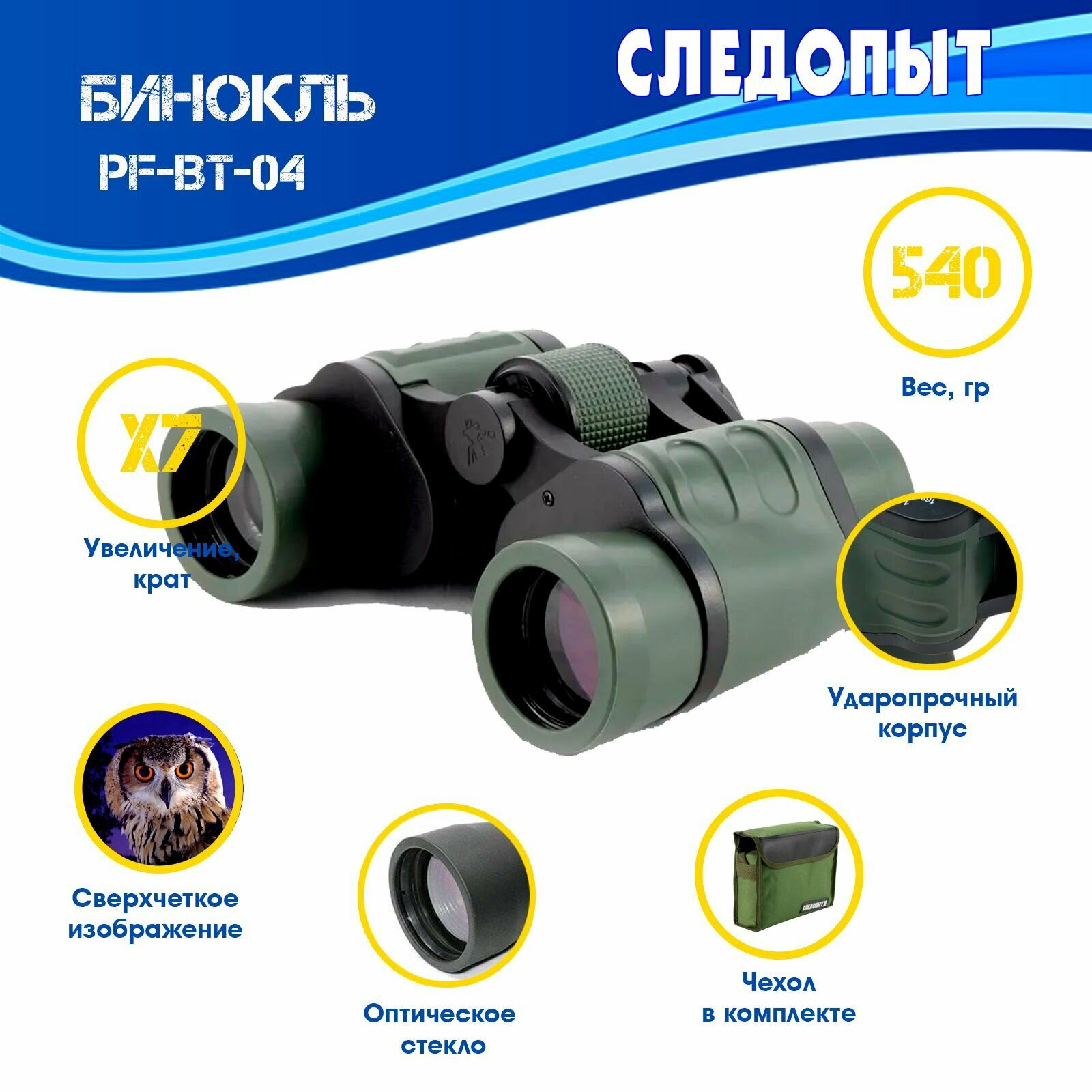 Купить Бинокль "следопыт", 7х35, зеленый-защитный, 165*50*145 мм, 540 гр., в чехле