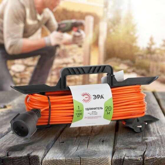 Удлинитель силовой Эра UFx-1-2x0.75-20m-IP44, розеток 1шт, 2x0.75 кв.мм, 6A, 20м, ПВС, рамка пластиковая, оранжевый [б0046821]