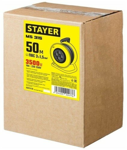STAYER MS-315, ПВС, 3 x 1.5 мм2, 50 м, 3500 Вт, силовой удлинитель на катушке (55078-50)
