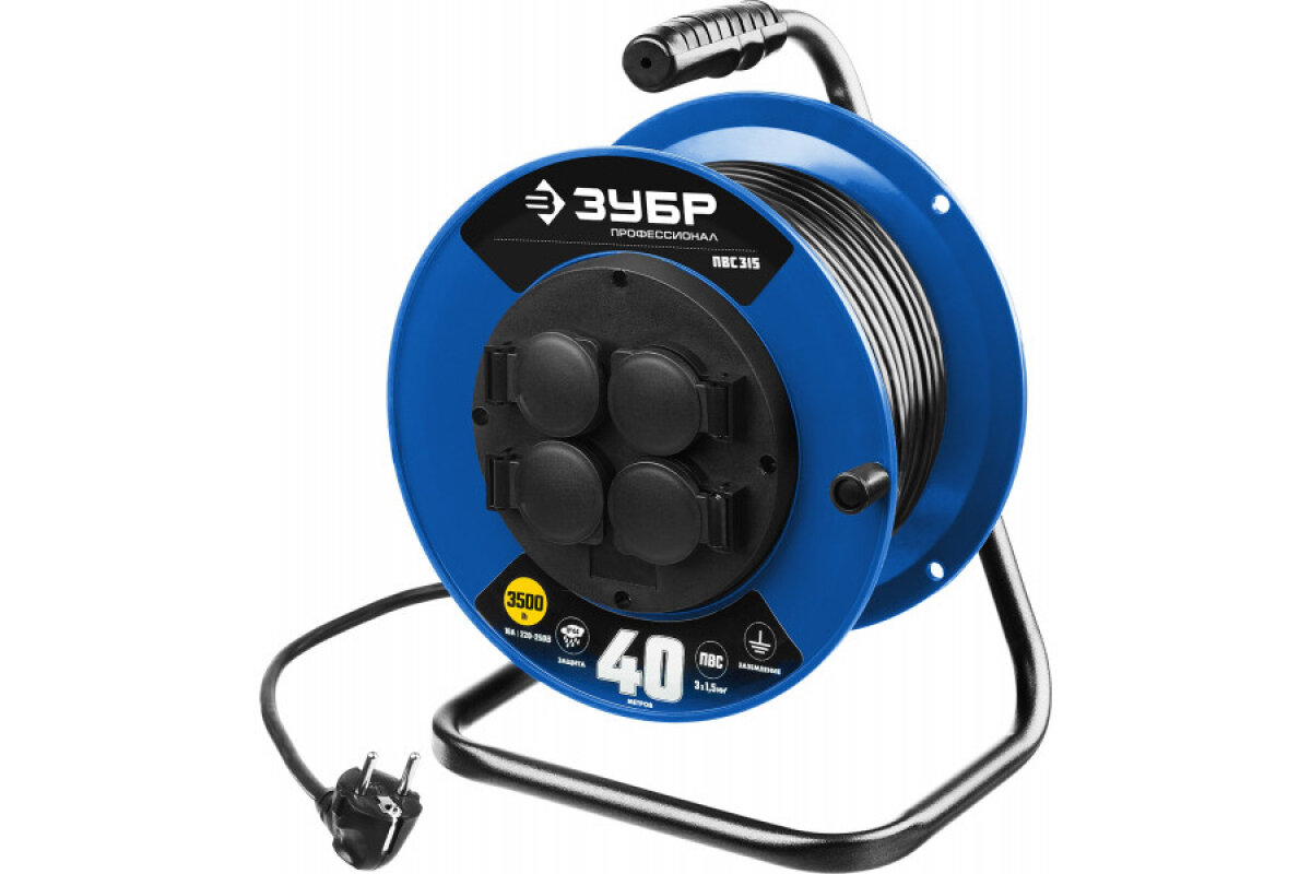 Удлинитель на катушке ЗУБР Профессионал ПВС-315 40м 3500Вт 4 гнезда IP44 ПВС 3х1.5 ммD ( 55081-40 )