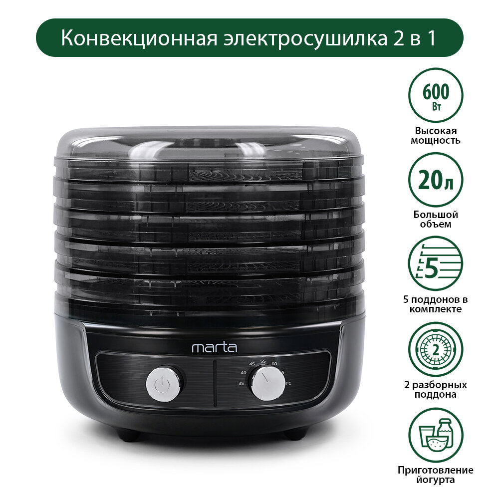Сушилка для овощей и фруктов Marta Mfd-8015ps темный обсидиан 600 W, 5 регулируемых по высоте поддон .