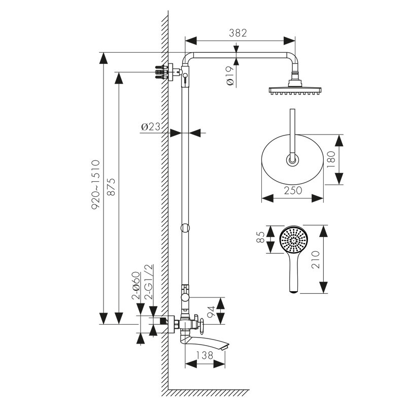 | Дополнительная информация | высота стойки для душа: 875 мм; длина верхнего душа: 250 мм; ширина верхнего душа: 180 мм |