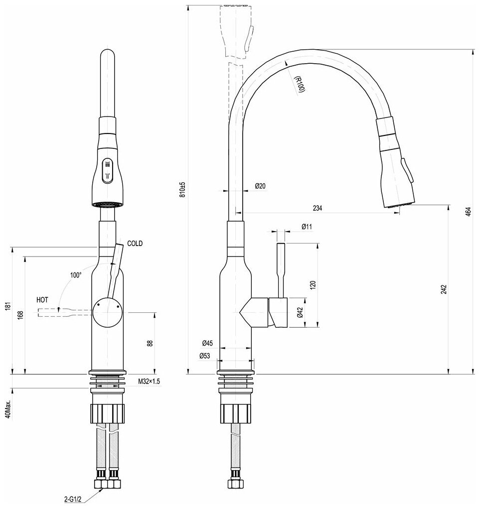 | Высота излива | 242 мм / 464 мм |
