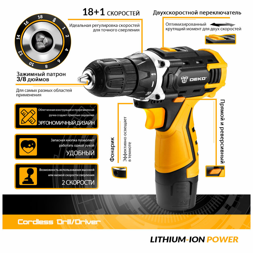 DEKO Аккумуляторная дрель-шуруповерт 12В DKCD12FU-Li