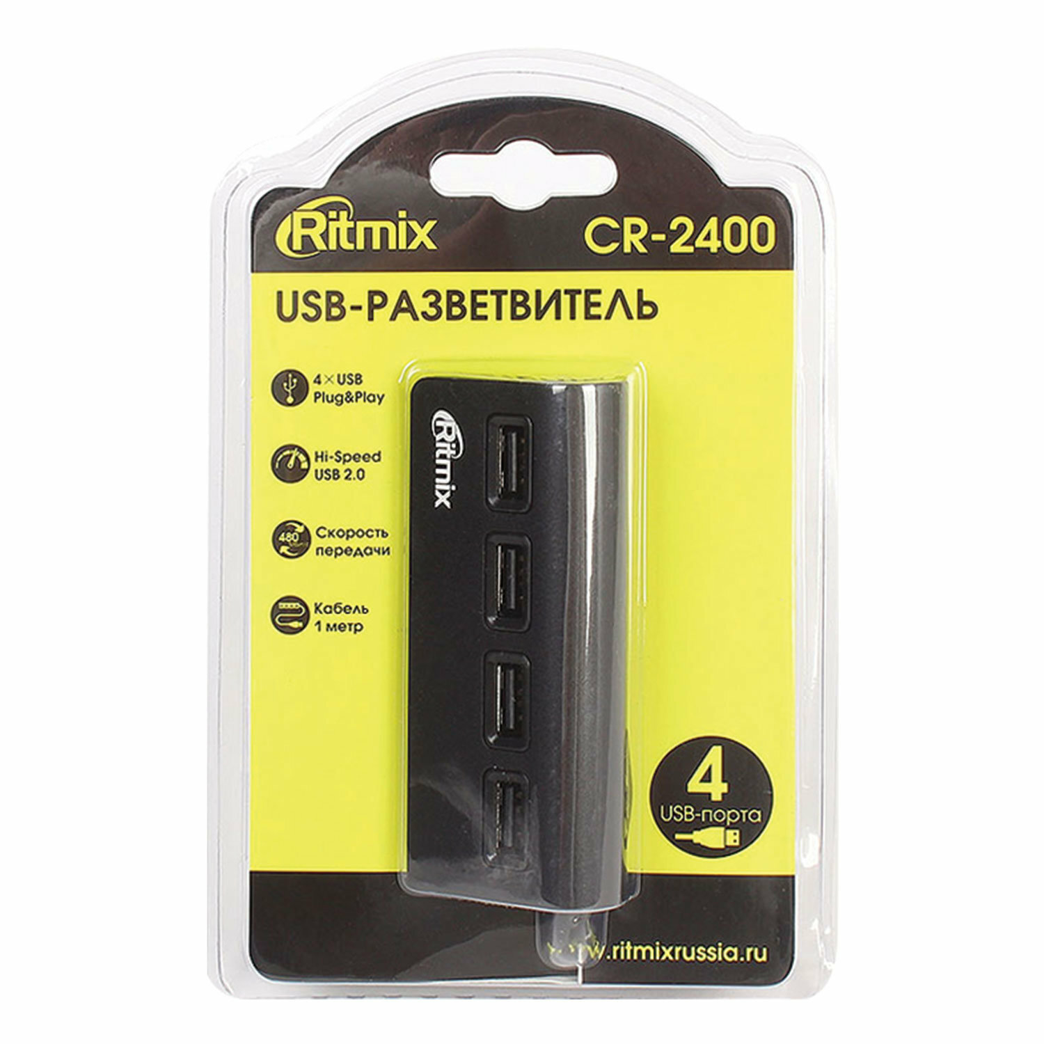 USB-HUB RITMIX CR-2400, черный, USB 2.0, 4 порта. Подключение к компьютеру/ноутбуку, питание по USB. Высокая скорость передачи данных до 480 Мбит/с. Прочный алюминиевый корпус.. Нескользящее основание. Встроенный кабель длиной один метр. USB-штекер с держ