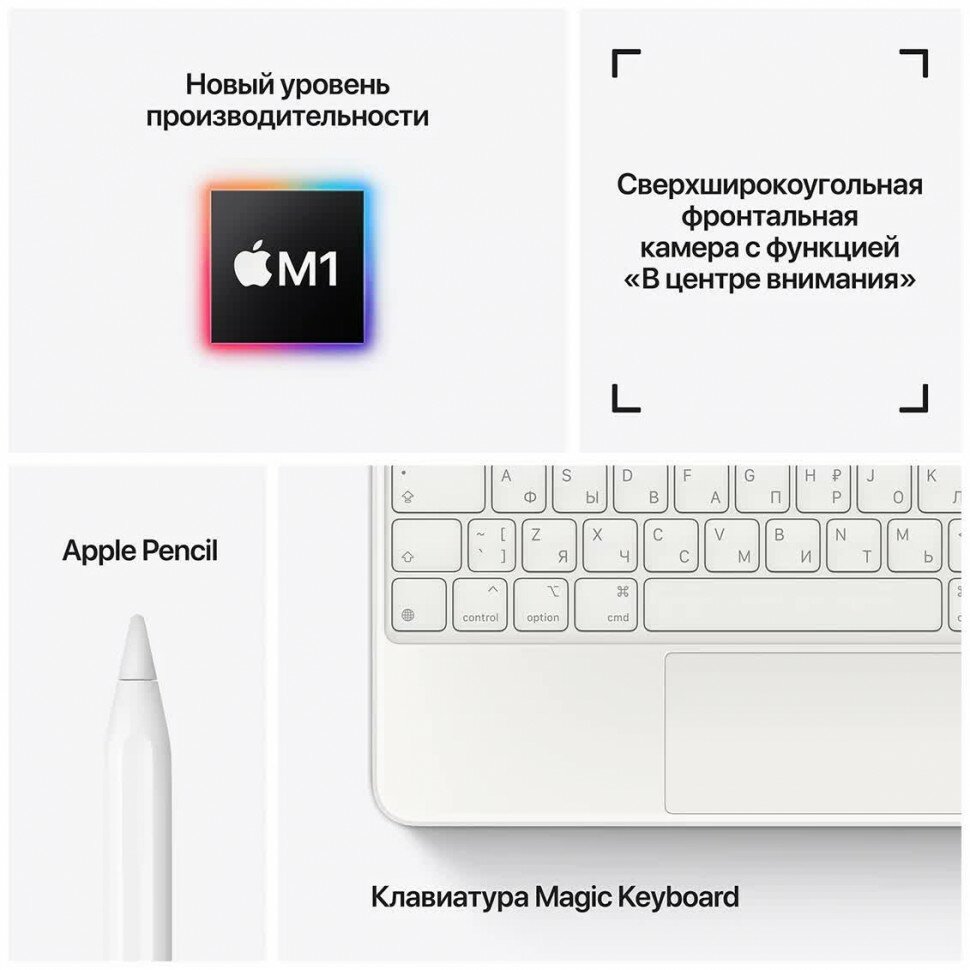 | Особенности | поддержка стилуса Apple Pencil; поддержка технологий ProMotion / True Tone; широкий цветовой охват (P3); TrueDepth; порт Thunderbolt 3/USB 4; функция камеры «В центре внимания»; яркость экрана: 600 кд/м2; дисплей Liquid Retina; поддержка клавиатур Smart Keyboard Folio и Magic Keyboard; функция точного определения местоположения iBeacon / ГЛОНАСС / GPS |