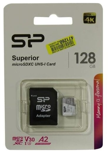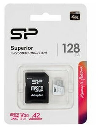Карта памяти microSDXC UHS-I U3 Silicon Power Superior 128 ГБ, 100 МБ/с, Class 10, SP128GBSTXDA2V20SP, 1 шт., переходник SD