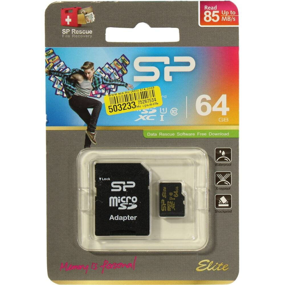 Карта памяти Silicon Power Elite microSDXC 64 ГБ Class 10, UHS Class 1, U1, R 85 МБ/с, адаптер на SD