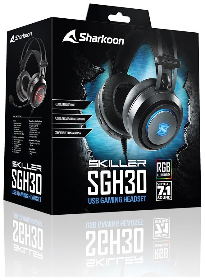 Гарнитура Sharkoon Skiller SGH30 проводная, 20-20000 Гц, 32 Ом, 92 дБ, USB, 100-10000 Гц, -56 дБ, 40 мм, RGB, цвет: черный