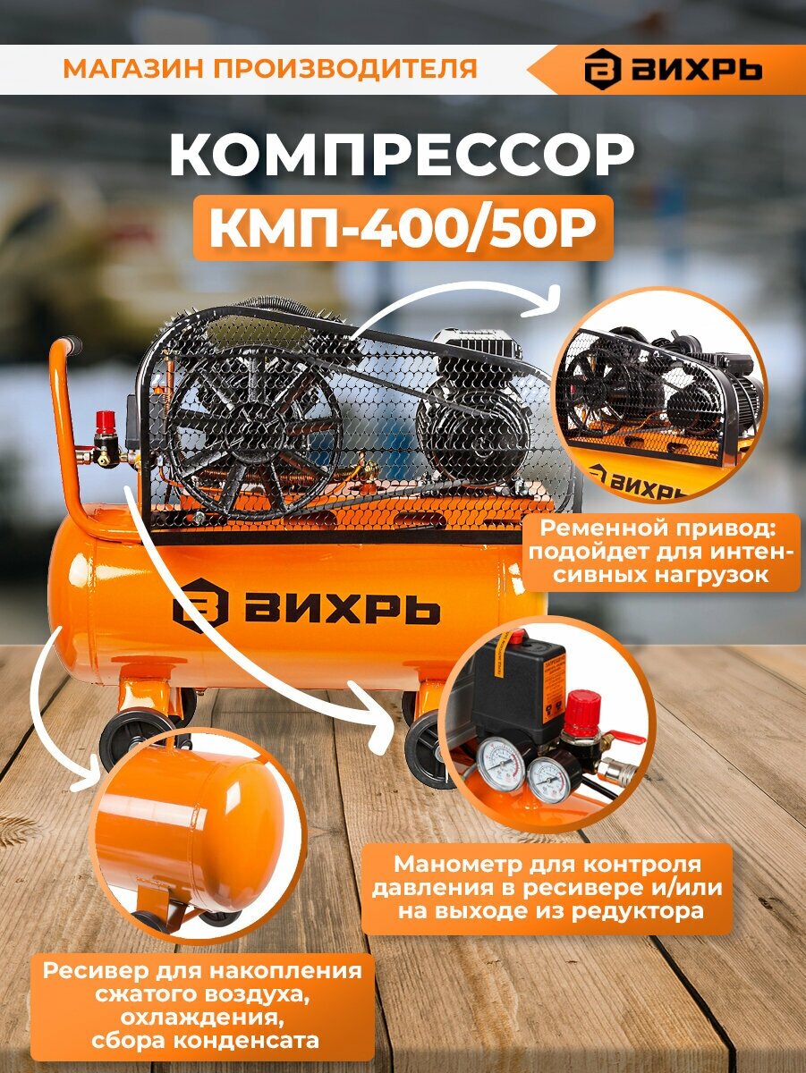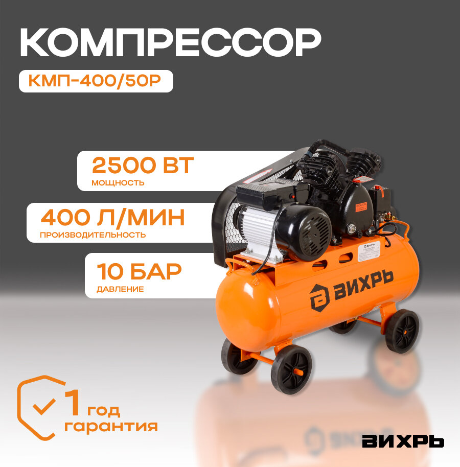 Компрессор "Вихрь" КМП-400/50Р, ременной, масляный, 2500 Вт, 400 л/ч, 50 л, 2 цилиндра Вихрь 5441508 .