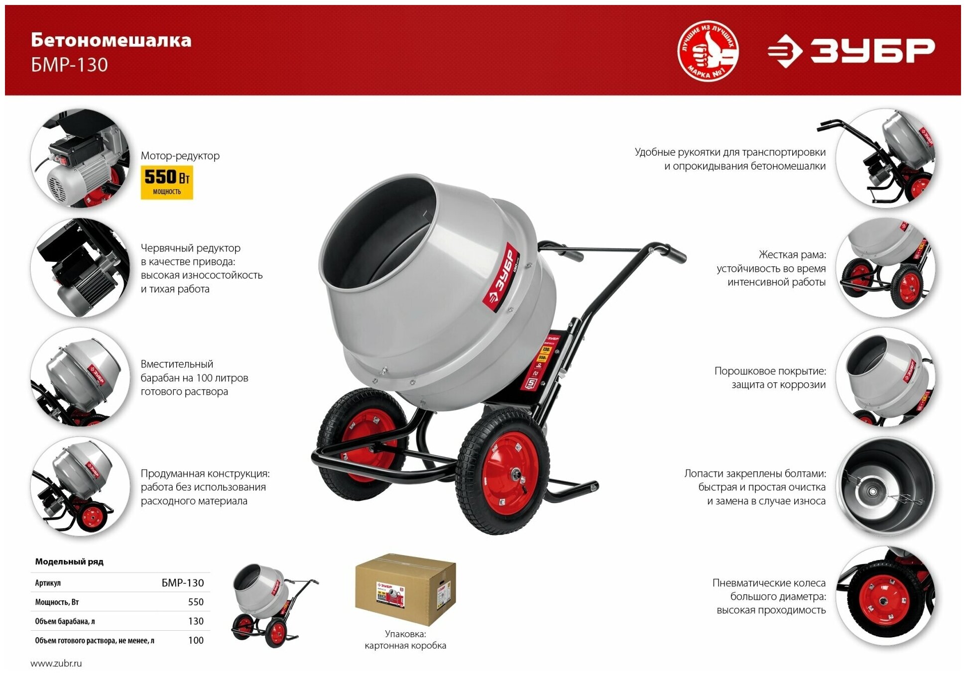 ЗУБР 130 л, 550 Вт, бетоносмеситель с редуктором (БМР-130)