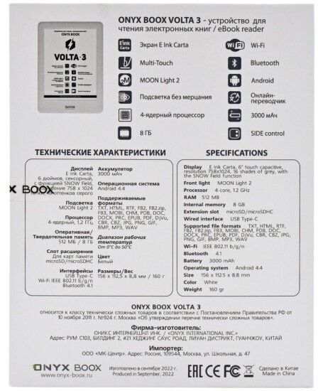 | Отзыв: | Первая книга от ONYX BOOX , пока все устраивает, кроме скорости загрузки при включении, до этого был Pocketbook. Pocketbook работает быстрее чем Volta 3. Пожалела что не взяла Volta 4, в нем 11 андроид. |