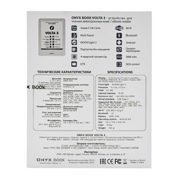 Электронная книга ONYX BOOX Volta 3 8 ГБ, белый