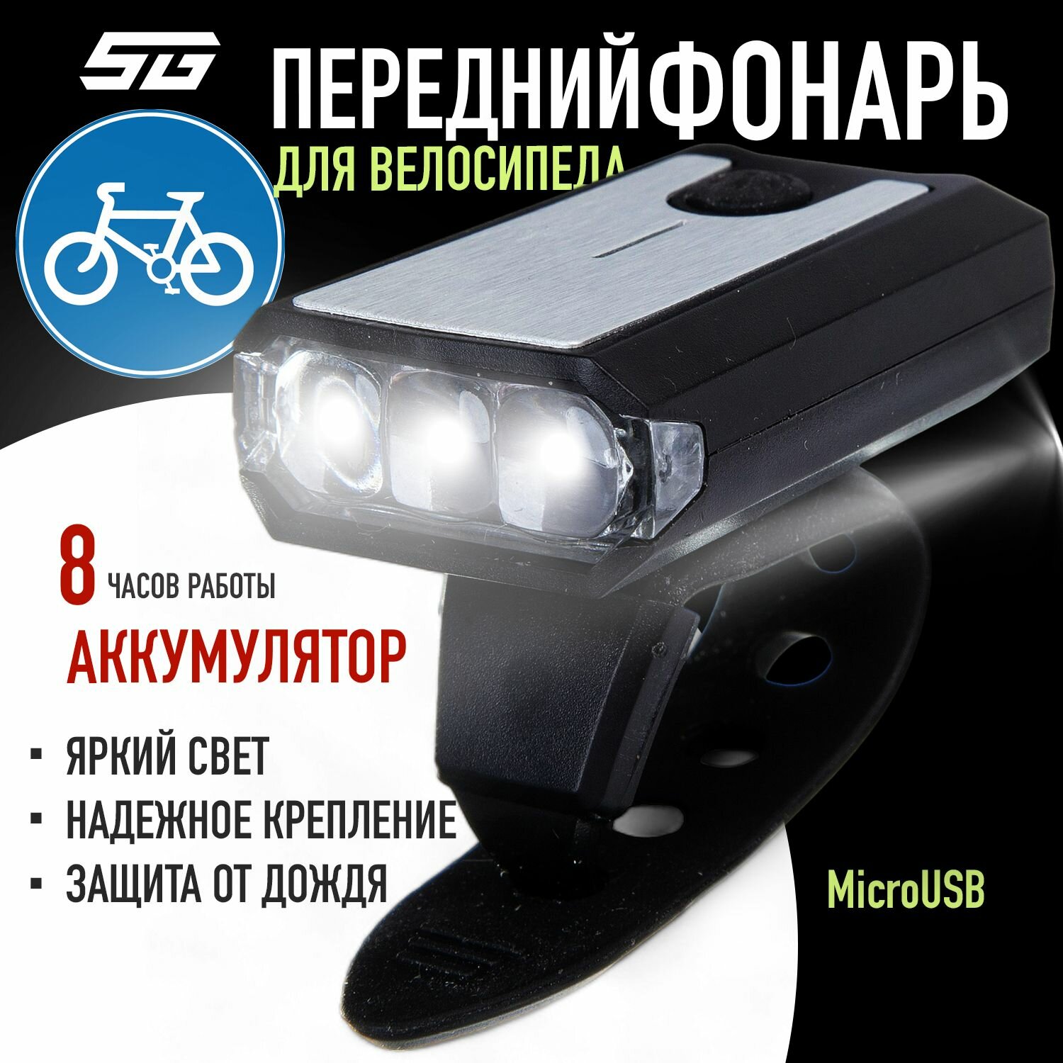 Фонарь передний STG, 3 светодиода, 2 режима, аккум 3.7V (300mAh)