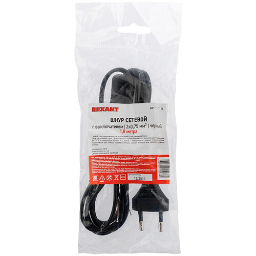 Электроаксессуары (REXANT (11-1134) Сетевой шнур с выкл. 2х0,75 мм2, 1,8 м черный)