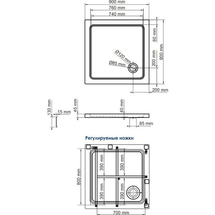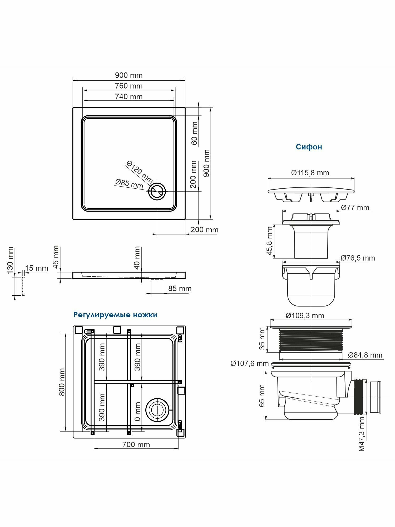 River Поддон для душа WEMOR 70/14 S квадратный 700*700*140 мм, с сифоном