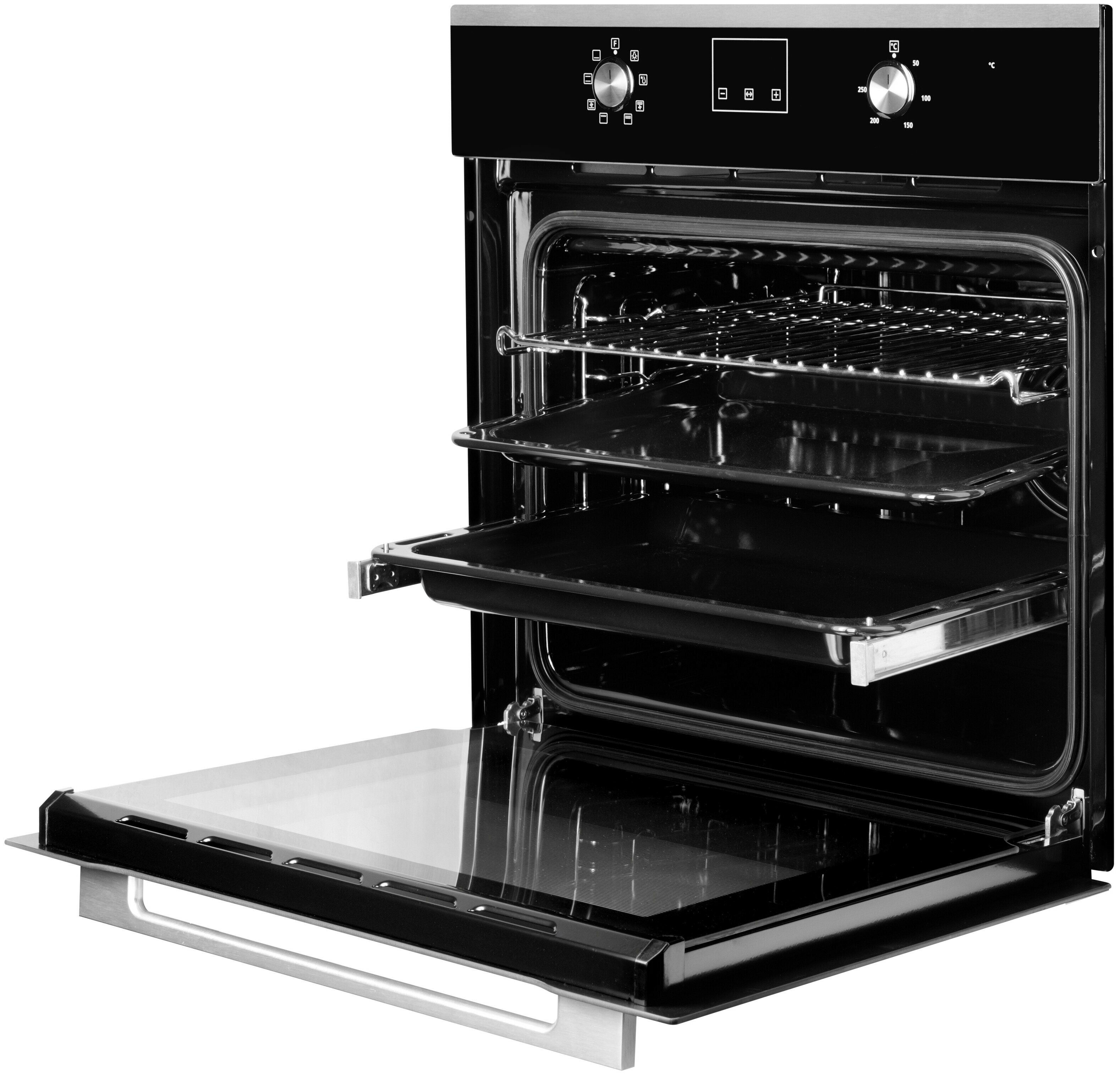 | Плюсы: | Защита от детей, 3 стёкла, дисплей есть, таймер, много режимов, телескопические направляющие, 2 противня |