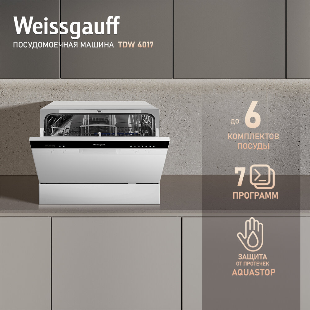 Настольная посудомоечная машина Weissgauff TDW 4017 D 3 года гарантии, быстрый режим, таймер, функция самоочистки, возможность дозагрузки посуды