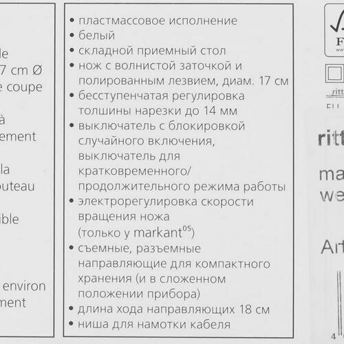 Ниже Вы можете прочитать отзывы на Ломтерезка Ritter Markant05, ознакомится с подробными характеристиками, посмотреть интересные обзоры и фотографии на Ломтерезка Ritter Markant05.