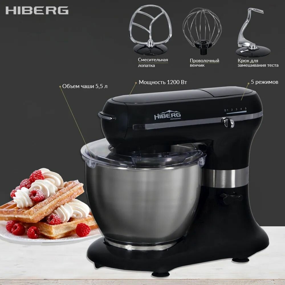 Планетарный миксер Hiberg 1255B, 1200Вт, 5,5л, нерж сталь, импульсный