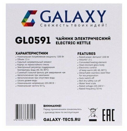 Galaxy Чайник электрический Galaxy GL 0591, стекло, 1200 Вт, 1.5 л, подсветка, заварник, голубой