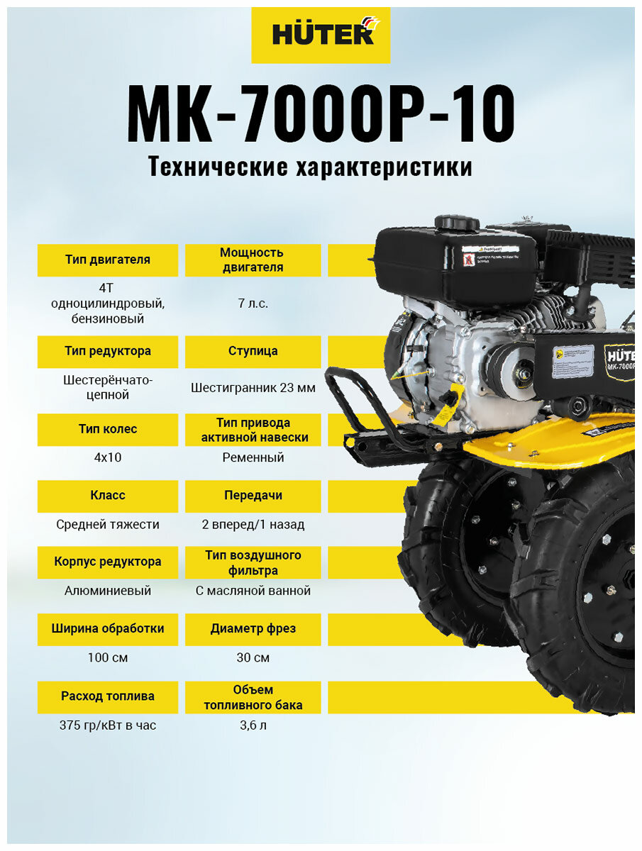 Мотоблок Huter МК-7000Р-10-4х2, бензиновый, 30х100 см, 5.15 кВт, 7 л.с, 3.6 л Huter 9717322