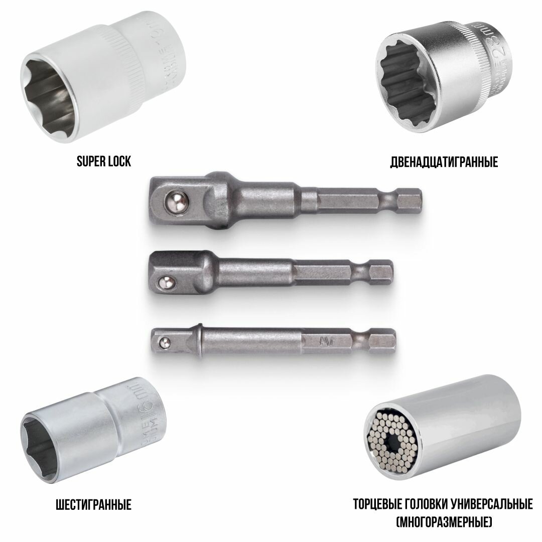 | Плюсы: | Очень удобный набор переходников с шестигранника под биты на квадрат для торцевых головок. |