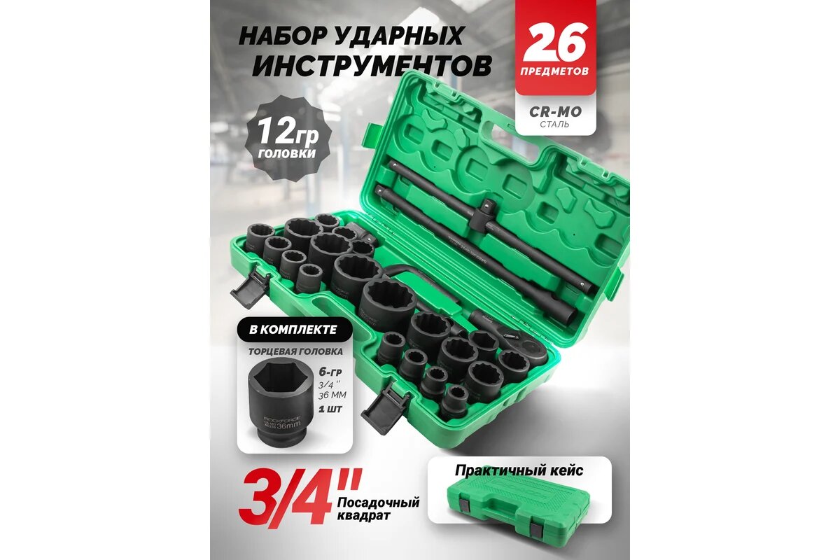 Набор инструментов 3/4, 1 дюйм. ударных 26 предметов 12-гран. ROCKFORCE