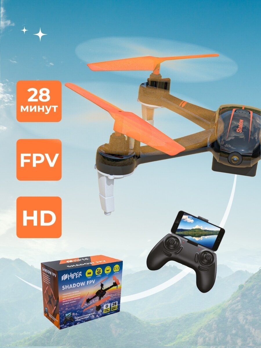 Радиоуправляемый квадрокоптер HIPER HQC-0001 SHADOW FPV, время полета до 28 минут, автоматическое удержание высоты, камера HD 720P, полет от первого лица, слот для SD карты, система стабилизации, 3 режима скорости, кульбиты, режим headless, черный/оранжев