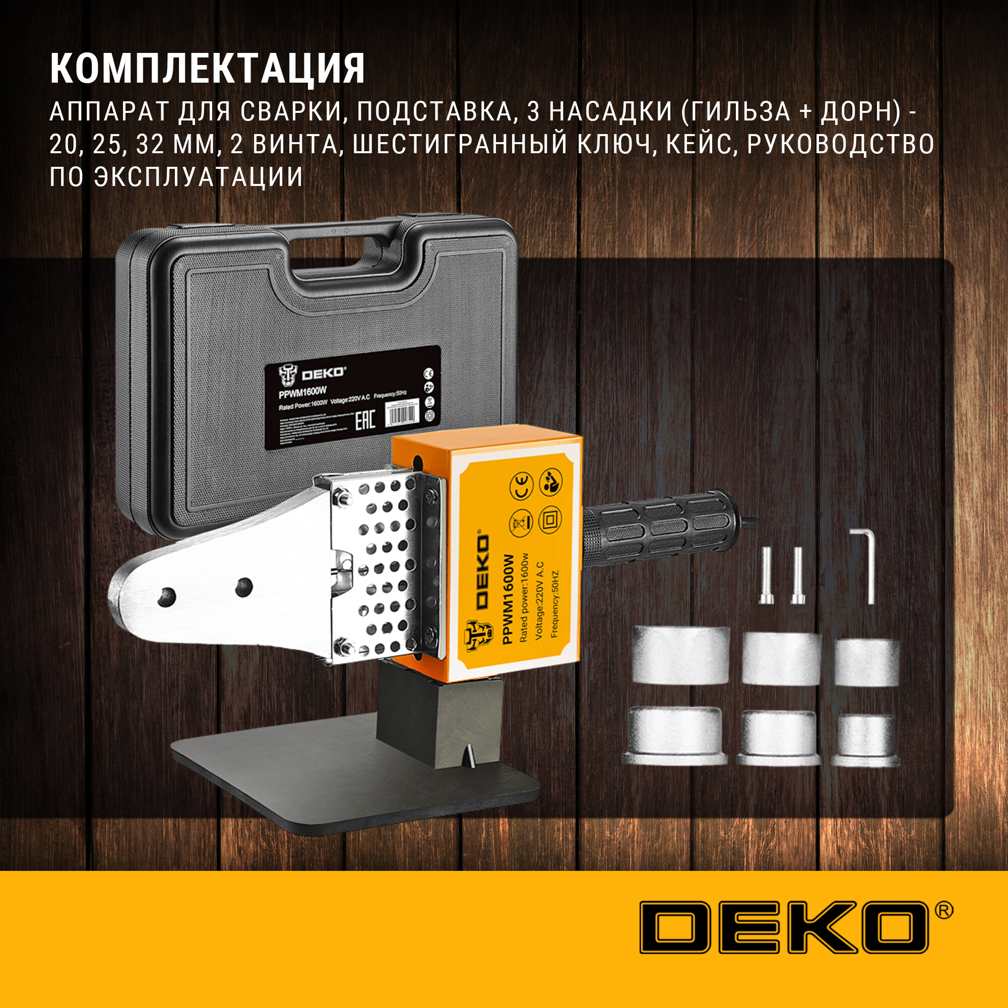 Аппарат для сварки полипропиленовых труб PPWM1600W DEKO в пластиковом кейсе, 3 насадки (20-32 мм) 063-4203