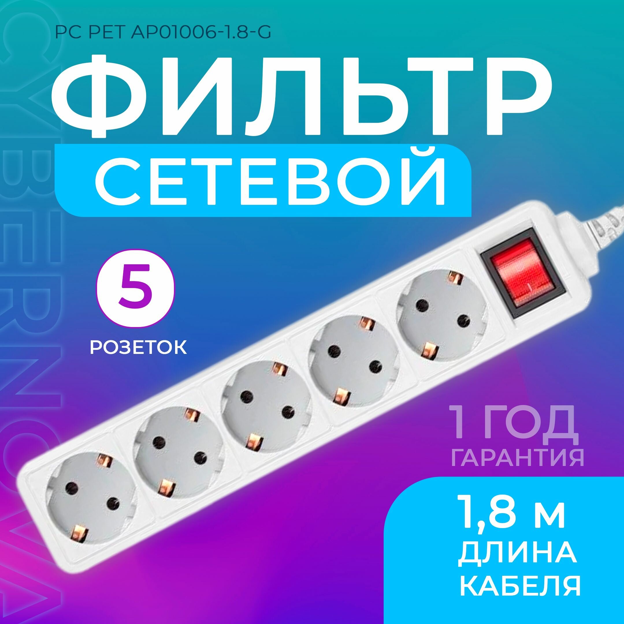 Сетевой фильтр PC Pet AP01006-1.8-G 1.8м (5 розеток) серый (пакет ПЭ) (6 шт. в упаковке)
