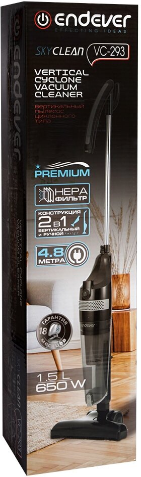 Пылесос вертикальный для дома Endever VC-292/293/294 2в1 вертикальный/ручной / 650 Вт / мощность всасывания 120 Вт / пылесборник 1,5л / циклонный фильтр, HEPA фильтр