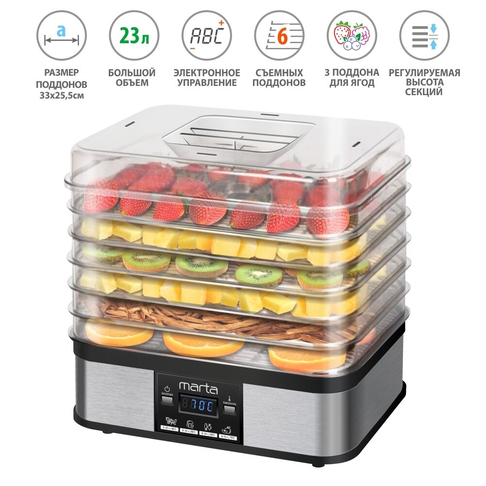 Сушилка для овощей и фруктов MARTA MT-1885 6 уровней + 1 поддон для пастилы + 3 для ягод с электронным контролем температуры, черный жемчуг