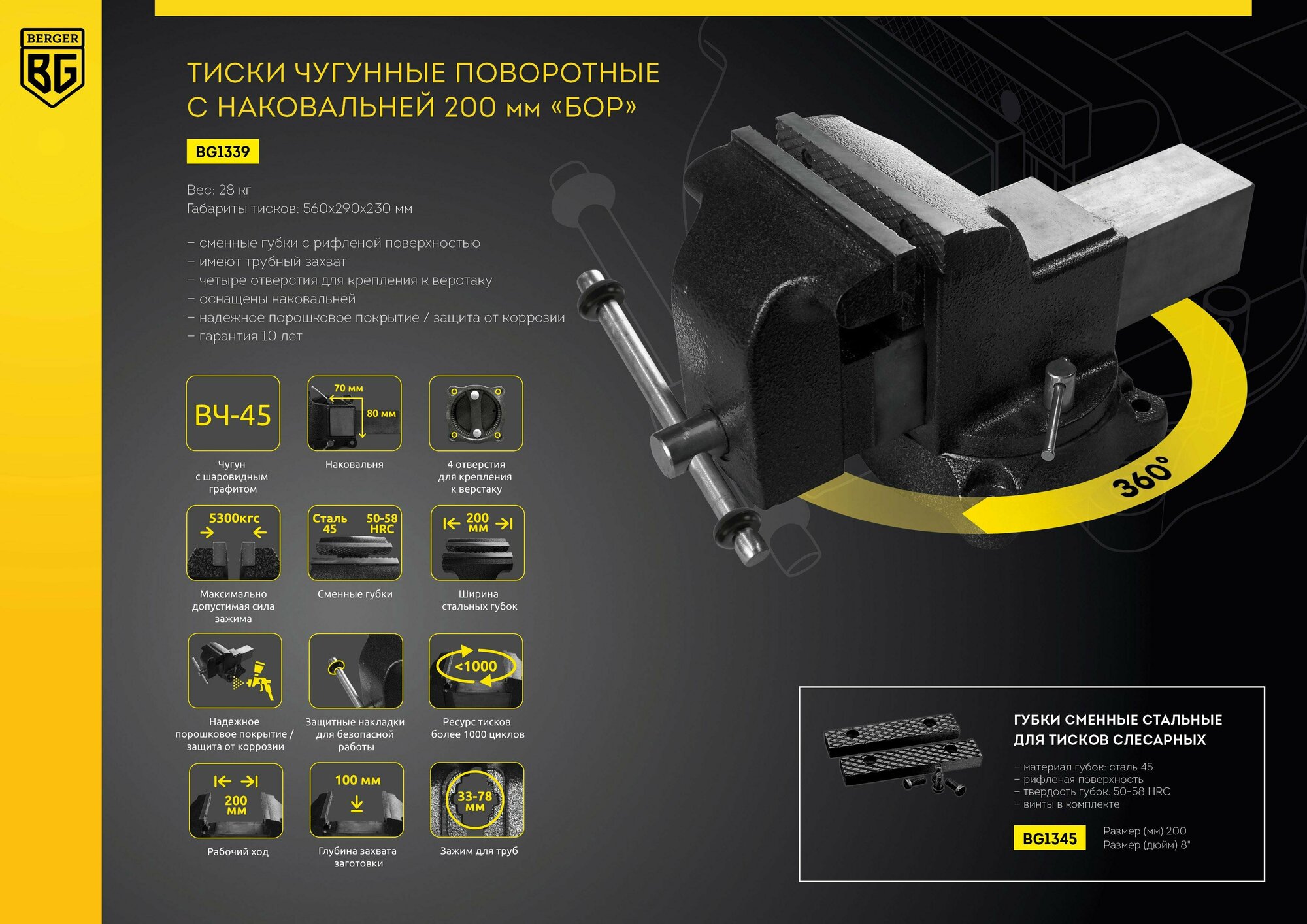 BG1339 Berger BG Тиски чугунные поворотные с трубным зажимом и наковальней БОР 200мм BG1339 .